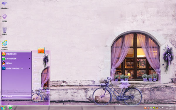 香气弥漫win7简洁主题由系统之家提供下载,这款主题的桌面背景是紫色的窗外放满了薰衣草的花盆,还有紫色的自行车,车篮里也是满满的薰衣草,光是看着就感觉香气弥漫了,喜欢这款主题可在系统之家下载~